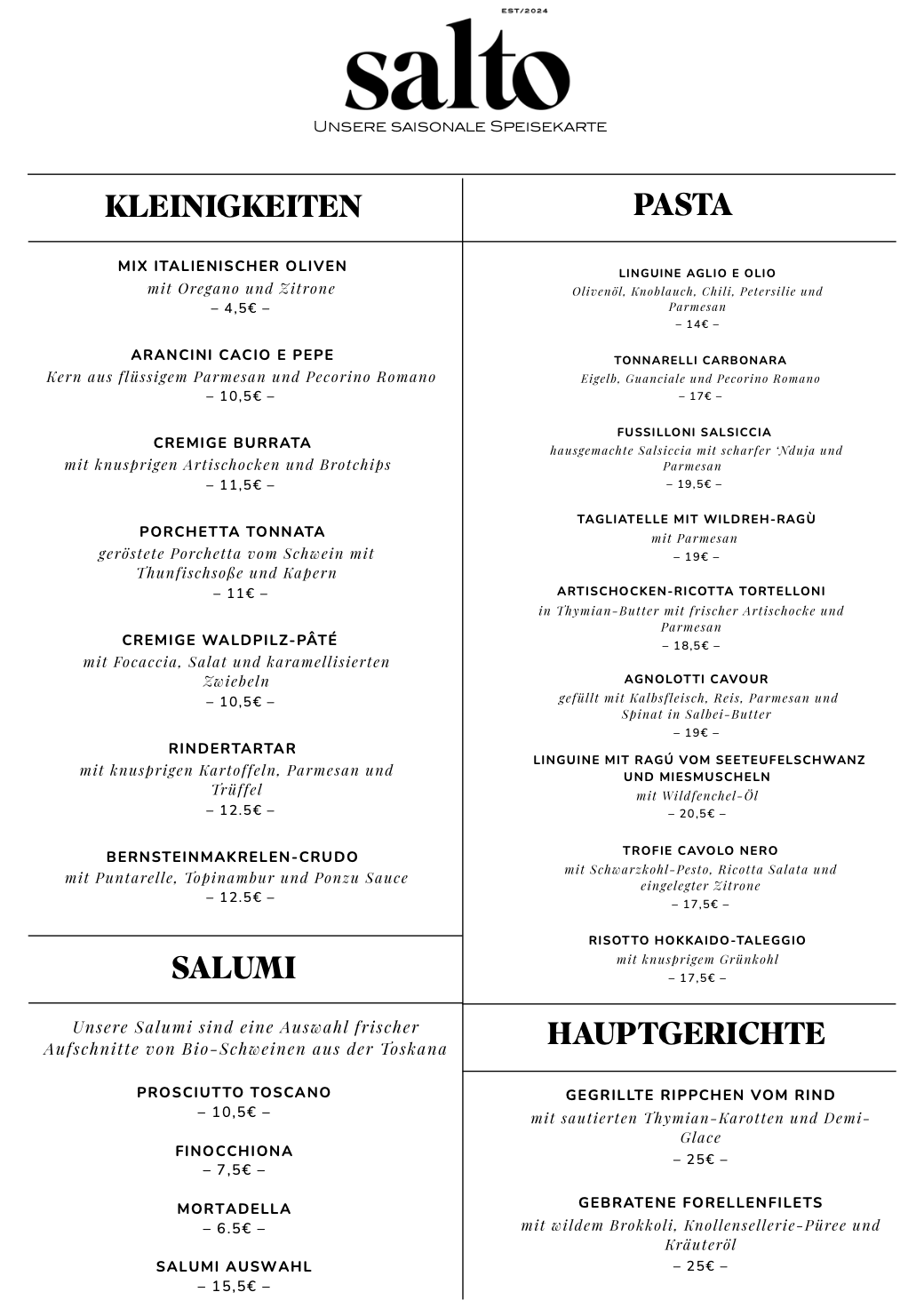 Traditionell und modern, frisch und regional. Das Beste aus deutschen und italienischen Zutaten, von unseren erfahrenen Köch:innen für Sie zubereitet. Unsere Winterkarte
